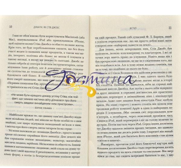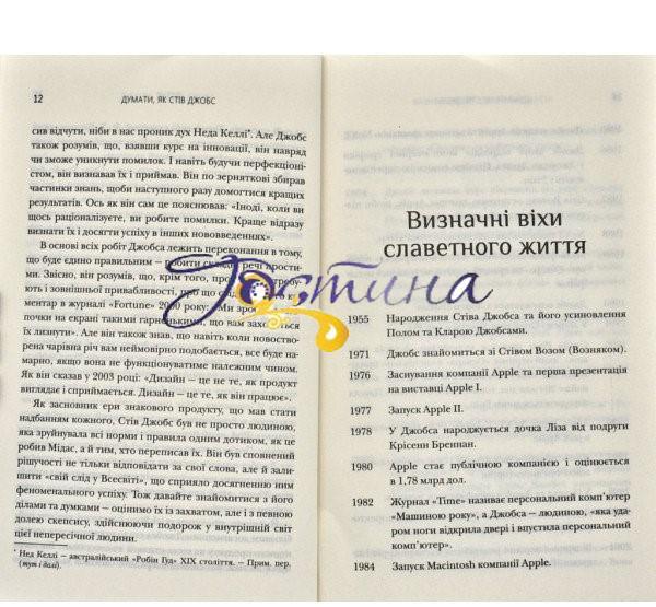 "Думати, як Стів Джобс" розкриває філософію та ретельно відпрацьовані навички, які Джобс використовував в його подорожі до вершини та у консолідації унікального місця Apple у суспільній свідомості. З його думками про інновації, порадами: як знайти натхнення чи представити ідею, рекламу та багато іншого Ви можете зануритися у розум майстра.