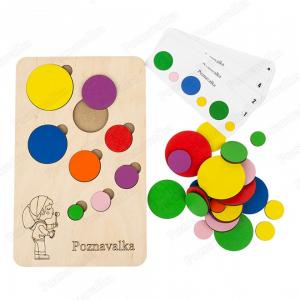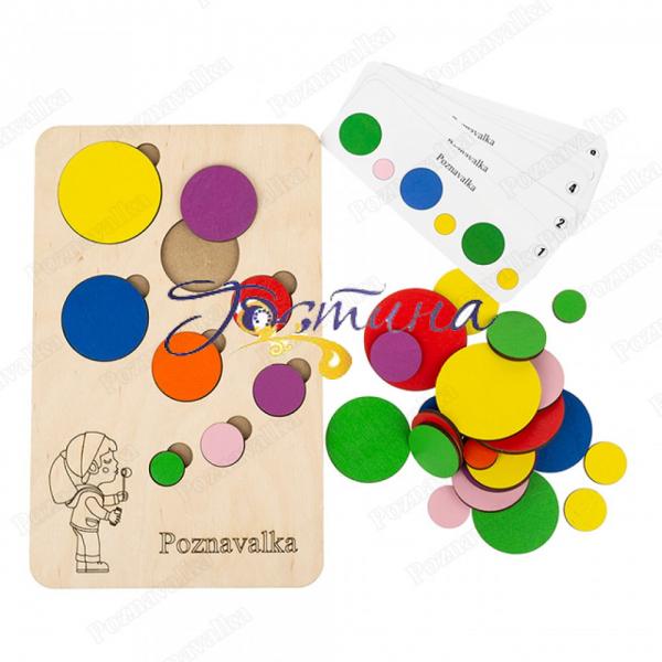 Комплектація: 1 плашка (16,5 * 24,5 см)Гуртки від 2 см до 5 см, 32 штукиКартки 10 завданьматеріал: дерево (фанера)вік від 1 року