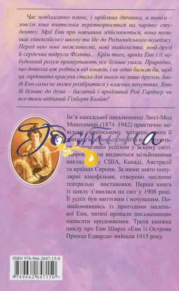 Ім’я канадської письменниці Люсі-Мод Монтгомері (1874-1942) практично невідоме українському читачеві, проте її книжки вже понад століття користуються величезним успіхом у всьому світі. Щороку вони видаються мільйонними накладами у США, Канаді, Австралії та країнах Європи. За ними знято популярні кінофільми, створено численні театральні постановки. Перша книга із циклу з’явилася на світ у 1908 році. Її успіх був миттєвим і нечуваним. Познайомившись із пригодами маленької Енн, читачі прохали письменницю написати продовження. Третя книжка циклу про Енн Ширлі «Енн із Острова Принца Едварда» вийшла 1915 року.