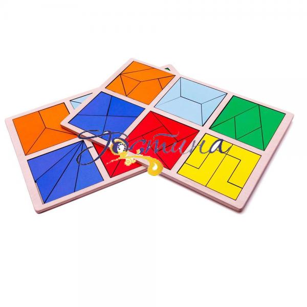 На кожній із них розміщено по 6 кольорових квадратів, які вміщують різну кількість елементів. Усього дитина має скласти 12 цілісних геометричних фігур.