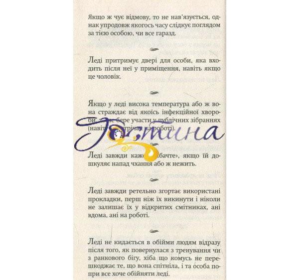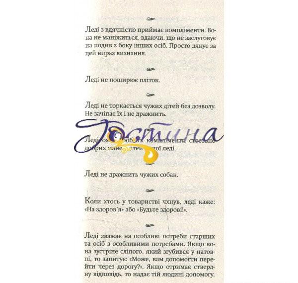 Ця книга є своєрідним інструктажем для леді. Як ставитися до сусідів? Якою виделкою їсти? Коли найдоречніше завершити розмову? Як організувати гостину? Як поводитися на роботі? Коли аплодувати у театрі? Яку сумочку обрати? Як одягтися у спортзал? Навіщо йти до лікаря? На ці та безліч інших запитань дівчина чи жінка, яка прагне бути леді, знайде відповіді саме тут.