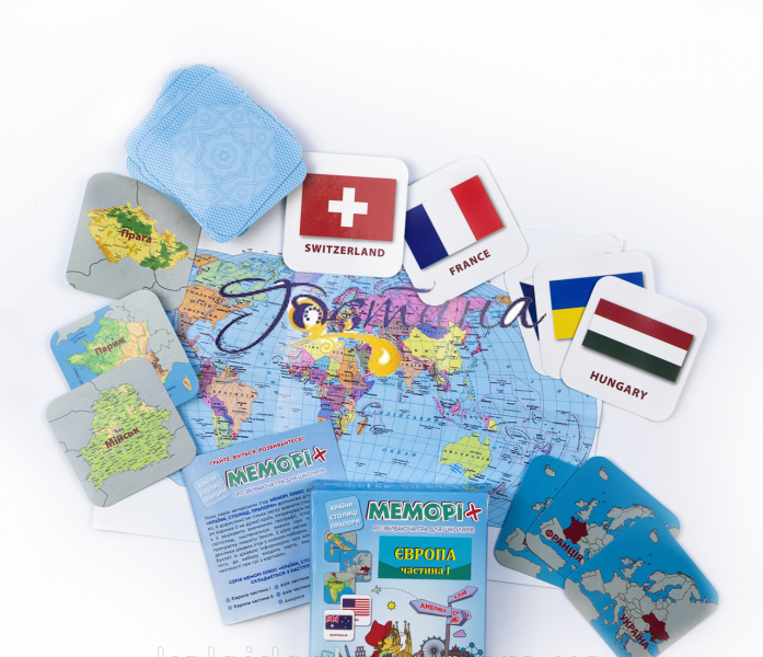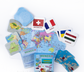 48 карток, по три на кожну з 16-ти представлених країн (місцеположення країни на континенті, столиця, прапор).
