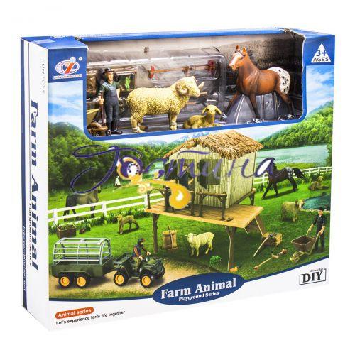 Ігровий набір 'Farm Animal' являє собою сарай з дахом, різним сільськогосподарським обладнанням та кормом для тварин. Також в комплекті є квадроцикл з причепом, 2 фігурки фермерів (9 х 3,5 см) і набір з 3-х різних домашніх тварин. Всі деталі набору виготовлені з міцного, якісного пластику, добре деталізовані і мають реалістичний вигляд.
