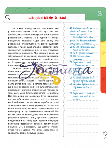 Сучасні діти виявляють значний інтерес до серйозних економічних питань. Звідки беруться гроші? Чому вони закінчуються? Як можна заробити гроші? Наше життя змушує дітей ставити такі запитання, і нам слід відповідати їм, як дорослим. У книзі є прості й зрозумілі матеріали, які допоможуть мамам і татам доступно пояснити дітям основи економічних знань. За допомогою цікавих історій дитина зможе збагнути сенс економічних понять, а практичні завдання допоможуть їй закріпити свої знання. Кольорові наліпки, які потрібні для виконання завдань, неодмінно сподобаються дитині й допоможуть вам зацікавити її процессом пізнання.