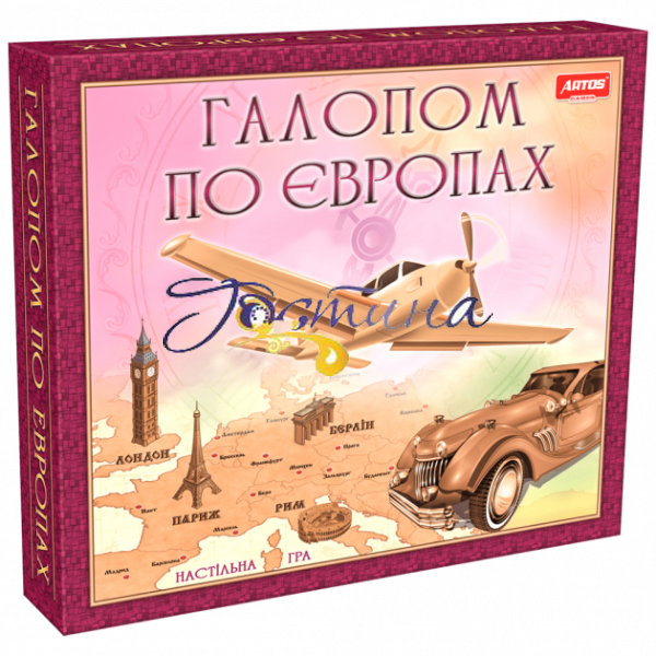Гра «Галопом по Європах» дійсно відповідає своїй назві. Гравцям необхідно буде якнайшвидше пройти маршрут, який вони самі склали, містами Європи. При цьому вони будуть робити перельоти між містами, а також рухатись автостопом від міста до міста. В результаті відвідувань міст Європи, які будуть в їхньому маршрути, вони набирають рейтингові очки мандрівника. Мета гри – набрати 100 очок в рейтингу мандрівника. Комплектація гри: - Ігрове двостороннє поле – 1 шт. - Гральні фішки – 4 шт. - Фішка-маркер – 4 шт. - Картки міст – 42 шт. - Авіаквитки – 16 шт. - Планшети рейсів на укр. мові – 4 шт. - Планшети рейсів на ріс. мові – 4 шт. - Правила гри.