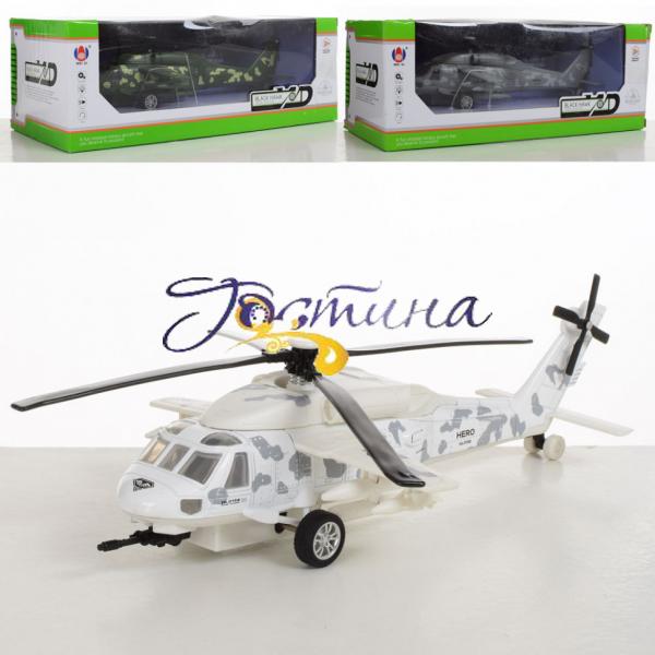 Іграшковий вертоліт військовий інерційний 9809, виконаний з металу, з елементами пластику, і зовні близький до оригіналу бойової машини. Іграшка має інерційний механізм, оснащена звуковими, світловими ефектами. Живлення здійснюється від батареї(табл). Модель користується увагою у більшості хлопчиків які люблять військову техніку і батальні ігрові битви. Виріб відповідає санітарно-технічним нормам і стандартам якості SGS. Рекомендовано для дітей від 3-х років і старше. Розмір упаковки: 30 х 14,5 х 10,5 див.