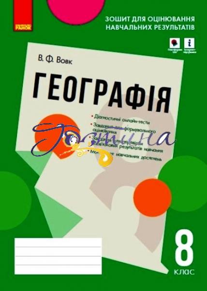 Посібник містить завдання для формувального, тематичного та річного контролю результатів навчання учнів 8 класу закладів загальної середньої освіти з курсу географії. Кожна робота представлена у двох варіантіах (річний контроль - у трьох). Видання також надає можливість онлайн-тестування. Призначено для учнів 8 класів закладів загальної середньої освіти та вчителів географії.