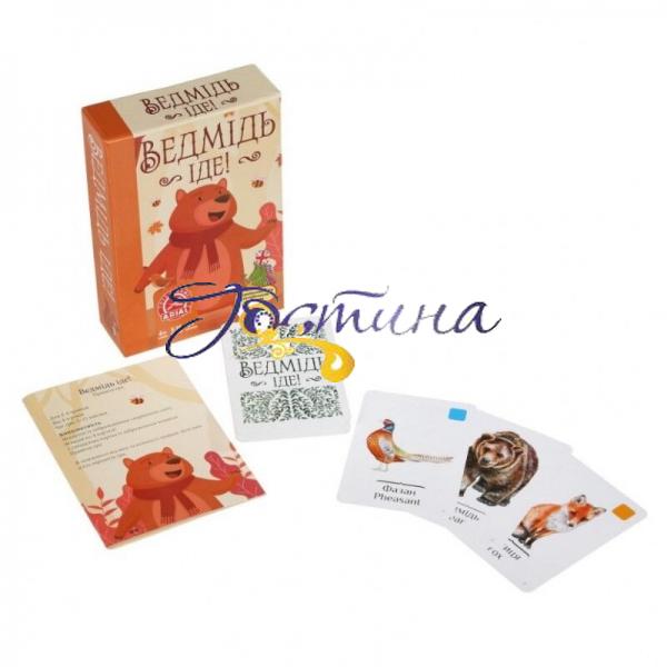 Ведмідь іде - захоплююча гра для малюків з простими правилами. За допомогою цієї гри діти познайомляться з різними тваринами, що живуть в наших широтах: ссавцями, птахами і комахами, вивчать їх назви українською та англійською мовами. В залежності від варіанту гри, треба буде збирати картки із зображенням різних тварин, або ж навпаки, скоріше позбутися від своїх карт. Гра передбачає мінімум 5 варіантів гри. Гра «Ведмідь іде» розвиває уважність, логічне мислення і швидкість реакції. Для дітей від 4-х років.