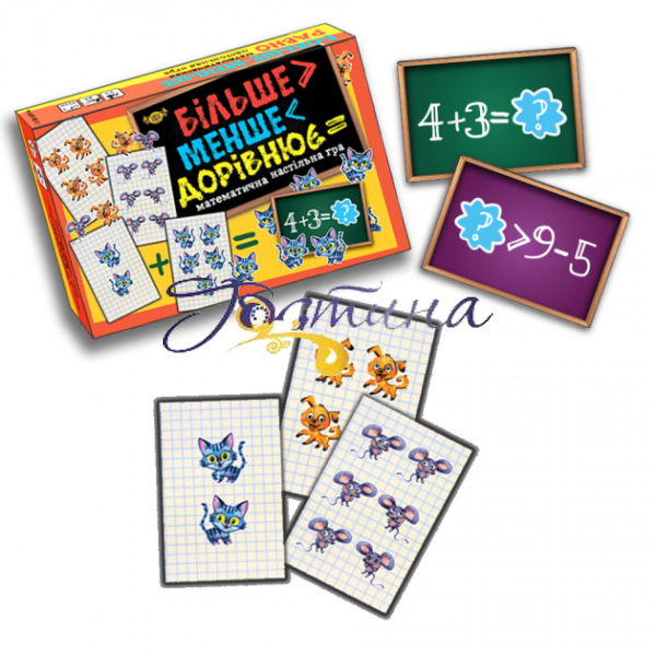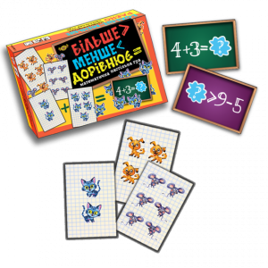 В комплекті гри — два види карток. На одних зображені звірята — миша, кіт, пес — в кількості від 1 до 8. На інших — арифметичні задачі.