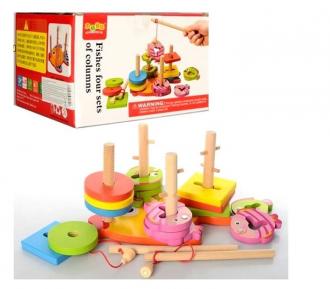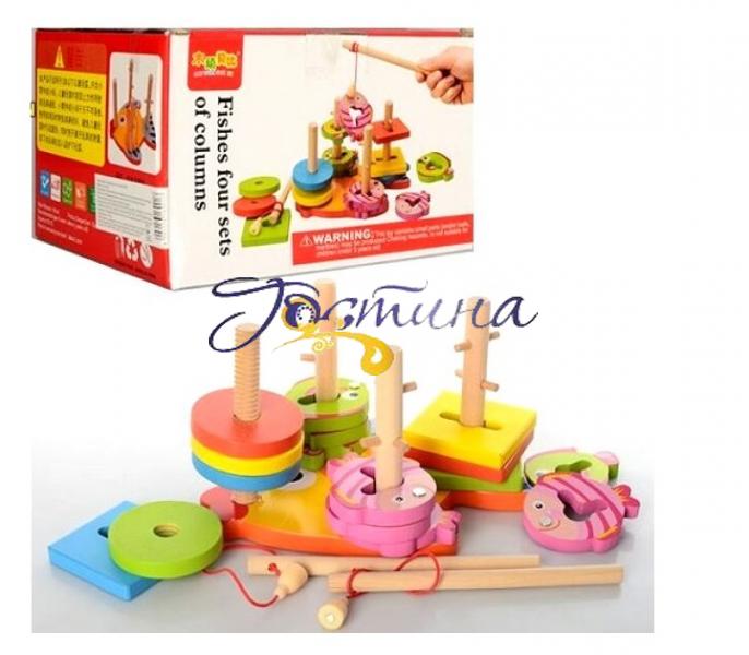 Дерев'яна іграшка - рибалка для малюків. На підставці 4 штирі. Один з яких має спіральну форму, на яку потрібно накручувати відповідні детальки. 3 штирька мають палички - перешкоди, через які потрібно провести колечка або квадратики і таким чином опустити предмети вниз. Так само в комплекті є вудка, яка має магніт на підставі "гачка", можна "зловити" кольорову дерев'яну рибку. Без стороннього запаху.