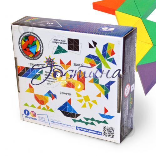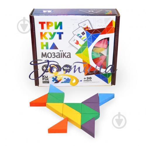 Оригінальна дерев'яна мозаїка від ТМ Kupik складається з 64-х різнокольорових елементів трикутної форми, з яких можна викладати стилізовані зображення тварин, рослин, предметів побуту, цифри і букви, геометричні форми, орнаменти та безконечники.