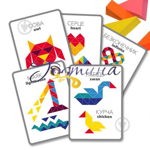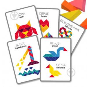 В наборі +10 двосторонніх кольорових карток з цікавими мозаїками, виклавши які, дитина зможе придумувати все нові й нові фігури.