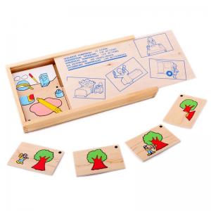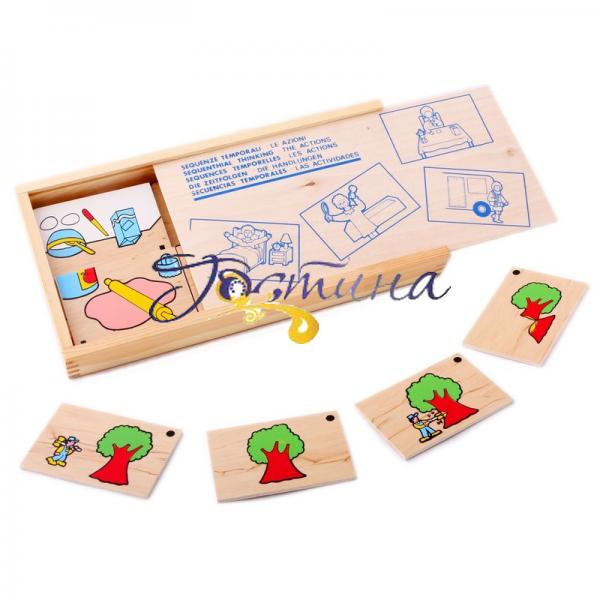 Іграшка дитяча дерев'яна 'Доміно' Черговість дій ' Настільна гра включає картки для 6 логічних ланцюжків, що зображують почерговість дій - що за чим відбувалося. Наприклад: рибка в акваріумі, на горизонті з'явився кіт, кіт заліз до рибки, кіт розбив акваріум.   Ігрова завдання - скласти логічні ланцюжки.   За допомогою даної гри відбувається: розвиток асоціативного і логічного мислення, уваги, пам'яті, уяви;збагачення і уточнення словникового запасу, вдосконалення звукового та граматичного ладу мовлення;розвиток навичок систематизації та класифікації, понятійного мислення;вдосконалення зв'язного мовлення, вміння пояснювати, міркувати, доводити.