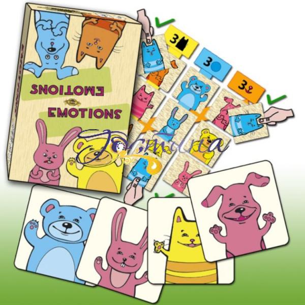 Серед логічних ігор. У комплекті 64 картки, зображення на кожній з них відрізняється від інших 3 ознаками: звіром (заєць, ведмедик, кіт, собака); емоцією (радість, здивування, гнів, гарний настрій); кольором (синій, жовтий, рожевий, оранжевий). Складай ряди з трьох однакових звірів, кольорів або емоцій — по горизонталі, вертикалі або діагоналі. Першим зробить свою “Трійку” В грі повинно бути кмітливішим, уважнішим і швидким. Комплектація: картки ігрові (62*62 мм) — 64 шт.; правила гри українською та російскою мовами. Видавництво Майстер