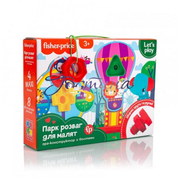Конструюємо атракціони, кріпимо деталі на болтик та гайку, вивчаємо кольори. Особливості: міцний картон, ліцензійний персонаж Fisher Price, додаткові аксесуари. Комплектація: 8 двосторонніх деталей, 4 пластикові болти, 4 гайки, інструкція. Упаковка: картонна коробка. Мова: українська. Вік: 1-3 роки