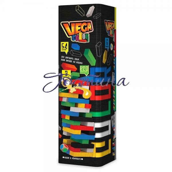 «VEGA COLOR» - Нова версія гри не тільки навчить стежити за балансом, бути зібраним і дуже акуратним, але й допоможе провести час активно та весело. Всі бруски тепер пофарбовано в 6 кольорів. Правила гри прості. Гравці по черзі кидають кубик і виймають із вежі бруски того кольору, який випав на кубику. І звичайно, головне завдання - не допустити обвалу вежі, інакше програєш. Гра позитивно впливає на дрібну моторику, координацію рухів, уважність, допомагає набути швидкості реакції, логічного мислення й безлічі інших корисних навичок.