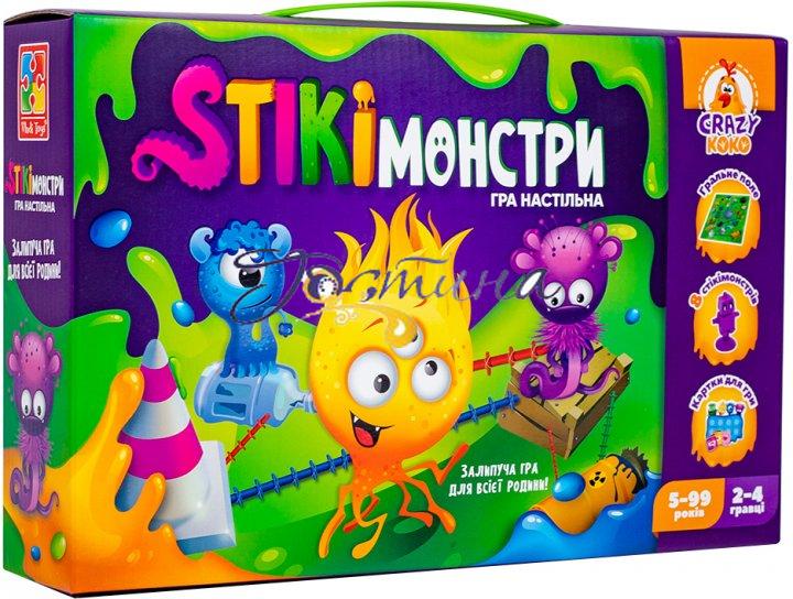 Кажуть, що десь серед слизу ховається 8 кумедних монстрів! Вони живуть у різних предметах, які потрапили туди зі світу людей. Спробуй відшукати їх разом з друзями! Мета гри – спіймати якомога більше стікімонстрів. Для цього кидайте з друзями по черзі гральний кубик та пересувайтеся кольоровими доріжками. Відкривайте баночки та виконуйте потрібні дії. Спробуйте знайти найкоротший шлях до монстрика, щоб упіймати його! Настільна гра «Стікімонстри» додасть веселощів будь-якому дозвіллю!