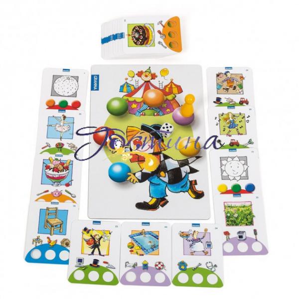 Ця гра вчить Вашого малюка основам аналізу та синтезу, розвиває асоціативне мислення і пам'ять. У наборі 90 карток із зображеннями. Кожен учасник вибирає собі по одній картці і відповідає на питання. Наприклад, на картці зображена мишка і їй пропонуються три страви на вибір: яєчня, полуниця і сир. Що вибере мишка? Якщо учасник знає правильну відповідь, він вкладає пальчик в отвір під вибраними зображеннями і перевертає картку. Якщо на зворотному боці цей отвір обведено синім кольором і над ним стрибає клоун - вітаємо, відповідь обрана правильно. Тепер картку бере наступний учасник і так до тих пір, поки картки не закінчаться.Вибір карток відбувається згідно планшету з намальованими різнокольоровими кульками. Учасники кидають кубик, ходять фішкою відповідно до випалої на кубику цифрі, і колір, на якому фішка зупиниться  є тим, картку з яким потрібно взяти наступною. Картки за темами професії, харчування, інтер'єр кімнати допоможуть малюкові розвинути його пізнавальні процеси, дізнатися нове і закріпити вже знайоме.