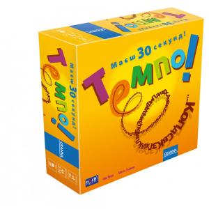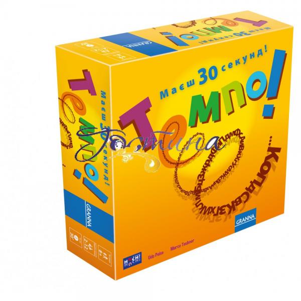 Темпо! Темпо!Божевільна вечірка у поєднанні зі словесними перегонами!1. Прості правила:Маєте вибір з 300 категорій різної степені складності. Пригадайте пов’язані з ними слова, які починаються на літеру, надруковану на ігровому полі перед вашим пішаком.2. Запаморочливі темпи.У вас є тільки 30 секунд, щоб пригадати потрібні слова. Вам знадобляться знання різних термінів. Час вимірюється таємно за заслінкою.Завдайте свій Темп у гонитві до фінішу!3. Унікальність!Змагайтеся індивідуально або в командах. Зберіть всю родину за ігровим столом або влаштуйте вечірку для друзів. Більше 300 категорій та двостороннє поле з трьох взаємозамінних частин надають безліч варіантів для змагань! Гра містить версію для дітей.Для них ми спеціально підготували стос карток з простими категоріями. Вміст коробки:• двостороннє поле• 180 карток• 12 дерев’яних пішаків• пісковий годинник із заслінкою• інструкція