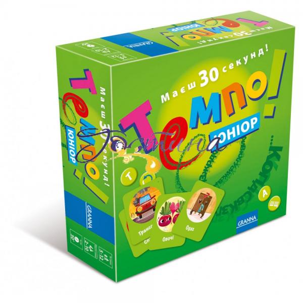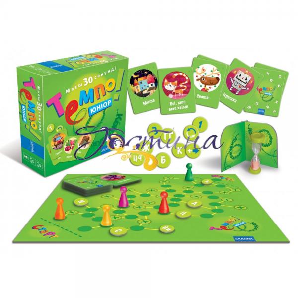Щоб малюки не відставали від дорослих у словникових перегонах – грайте з ними у Темпо! Юніор.  Розвивайте  мовлення, відчуття часу, тактику, світогляд та навички командної гри.  Божевільні гонки: Відкрий одну з тем та пригадай якомога більше слів, пов’язаних з нею. Кожне слово наближає тебе до фінішу, а жетони з літерами принесуть додаткові бали! Рахування часу: Ти повинен поспішати, щоб пригадати потрібні  слова за 30 секунд! Час вимірюється за допомогою прихованого піскового годинника. Спробуй не тільки знайти влучні слова, а й спосіб швидко подолати ігрове поле. Кожного разу нова гра: Різноманітні паролі та випадкове розташування літер на полі гарантують кожного разу неповторні змагання. Гра містить опцію командної гри, тож одночасно може грати до 10 гравців! Вміст коробки: ігрове поле; 60 карток; 48 жетонів; 5 пішаків; пісковий годинник із заслінкою; інструкція.