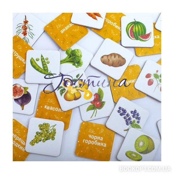 Це 56 карток із зображенням овочів, фруктів та ягід, які не лише допоможуть у навчанні дітей, розширять їх кругозір, тренуватимуть вміння розрізняти кольори, переключати увагу чи групувати за певною ознакою, а й дозволять вам разом весело провести час та нагуляти апетит! Все залежить від того, який з шести варіантів ігор ви оберете.