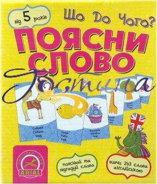 Дана гра передбачена для дітей від 5 років. Для малюків, які ще не навчилися читати, картки, що входять в комплект, мають малюнки, тому їм буде легко сприймати цю гру.  Ще одним важливим плюсом в цій грі є різні мови, які в процесі гри буде освоювати дитина. На кожній картці з малюнком написано це слово російською, українською та англійською мовами.  Суть гри полягає в тому, що гравці діляться на команди, одна людина витягує картку і пояснює слово на ній, не використовуючи однокореневі слова. Чия з команд швидше впорається із завданням, тобто відгадає всі слова, тим швидше діти доберуться до фінішу і виграють.  Море позитиву, сміху, веселощів і позитивних емоцій просто забезпечені з настільною грою «Поясни слово» від компанії «Arial».  Вік: від 5 років Матеріал: картон, пластик Кількість осіб: 2 - 4 Комплектація: 243 картки зі словами, інструкція.