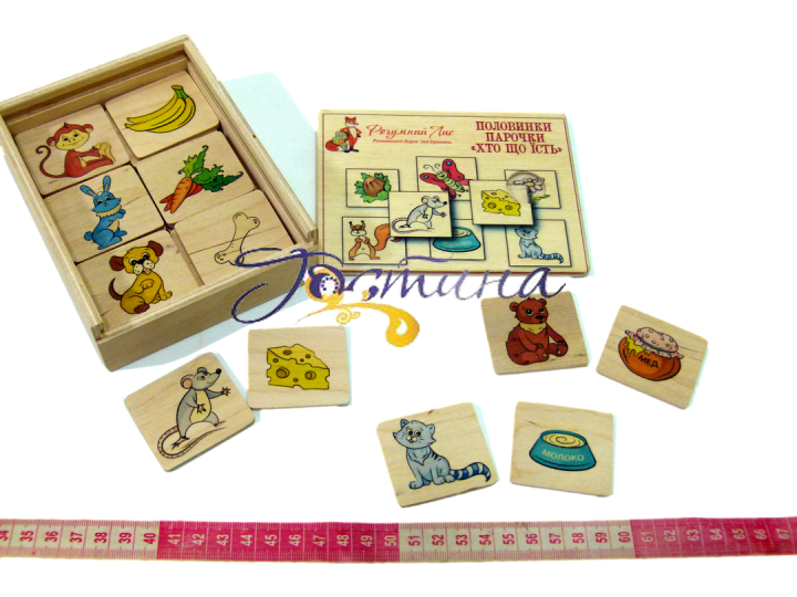 Дерев'яна яна гра Ассоциации половинки - парочки «Хто що їсть» пропонує малюкові побудувати логічний ряд: підібрати до картинки, на якій зображено тварину, їжу яку вона їсть. Це своєрідне лото з яскравими картинками зроблено з дерева, тому малюкові буде цікаво і зручно складати з нього цікаві ланцюжки. Дитина повинна буде для себе відповісти, чому одних тварин потрібно віднести до одного ряду, а інших - до іншого. Допомогти йому може в цьому мама, пояснивши, що є тварини, які їдять траву, а є такі, які считают за краще горіхи або молоко. Таке спільне проведення часу покращує мову дитини, розвиває спостережливість, логічне і абстрактне мислення. Кількість 24 шт.