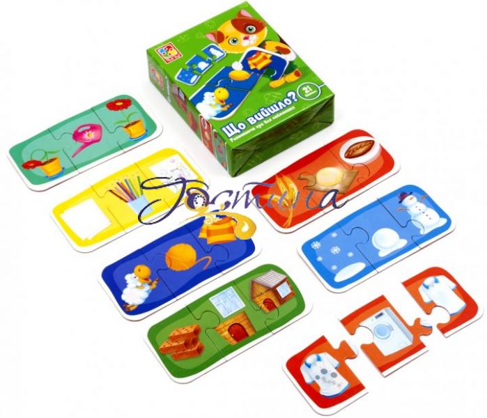 Що з чого випливає? Що виходить? Вивчаємо причиново-наслідкові зв'язки в цікавій ігровій формі! Розкладіть усі деталі на столі й уважно їх розгляньте. Пазли потрібно з'єднати відповідно до завдання. Наприклад, розглянемо ближче такі зображення: брудний одяг і пральна машинка. Що в нас вийде, якщо їх з'єднати? Чистий одяг. Шукаємо необхідну деталь і кріпимо її.