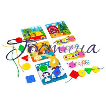 Комплектація: 12 ґудзиків, 4 двосторонні картки, 4 картки із завданнями, 4 шнурки, інструкція.