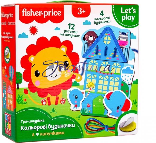 Вивчай кольори, пришнуровуй дахи та знайомся з тваринами! Набір Vladi Toys Fisher Price містить чотири кольорові будиночки. До кожного з них потрібно пришнурувати дах такого самого кольору, а також додати фігурки на липучках. Жираф і тигреня живуть у жовтому будиночку. А в якому живуть лисичка та метелик? Гра тренує логічне мислення, пам'ять, фантазію та дрібну моторику.