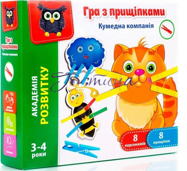 Набір містить персонажів і прищіпки. Малюк має визначити, яких деталей бракує кожному з персонажів, і доповнити їх за допомогою прищіпок. Наприклад, у фігурки із сонечком немає промінчиків. Беремо прищіпки та кріпимо їх до нашого сонця. Вивчаємо фігури далі. Перед нами котик, але в нього немає вусиків. Чіпляємо на щічки прищіпки, і готово!
