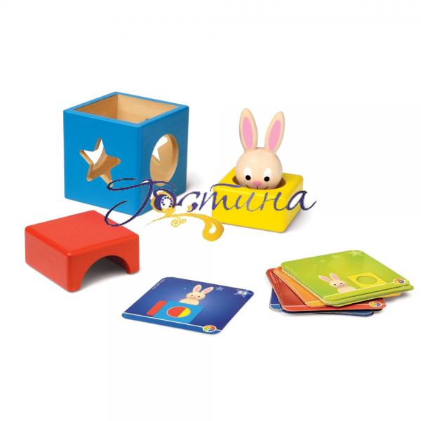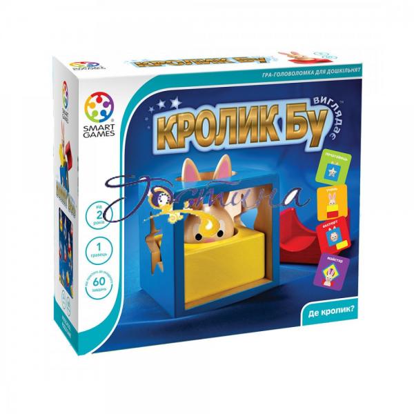 Кролик БУ – це об’ємна головоломка для дітей від 2 років з великими дерев’яними деталями. Кролик може дивитись на тебе кріз круглий або зірковий отвір. Він може стояти на синьому, червоному або жовтому блоках. Блоки можна поєднати по-різному, варіантів існує більше, ніж можеш собі уявити. Деякі завдання візуально схожі, але рішення для них різні в залежності від того, наскільки стирчать вуха кролика. З Кроликом БУ діти відкриють для себе дивовижний світ 3D простору. Можна розв’язати 60 завдань або грати та осягати поняття вище/нижче, внутрішній/зовнішній, видимий/прихований. Вміст: - червоний, жовтий, синій блоки, кролик; - картки з 60 завданнями; - листівка з правилами та відповідями. Як грати:1. Вибери завдання.2. Спробуй побудувати композицію, що намальована в завданні використовуючи один або декілька блоків та кролика.3. Рішення знайдено, коли вид спереду твоєї композиції та малюнок в завданні співпадають.