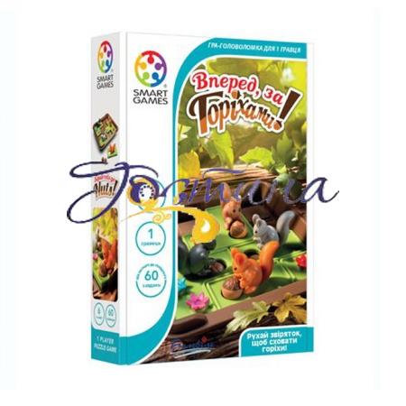 Зима наближається, гайда збирати горіхи!Допоможи звірятам підготуватися до зими! Зможеш перемістити вивірку так, щоб вона сховала свій горішок під землею? “Вперед, за горіхами!” - це розсувна гра-головоломка з 60 захопливими завданнями, щоб перевірити твої навички.Ігрове поле з кришкою ідеально підходить для подорожей! ГРА СТИМУЛЮЄ ТАКІ КОГНІТИВНІ НАВИЧКИ: планування; логіку; вирішення проблем; візуальне сприйняття; концентрацію. Правила гри