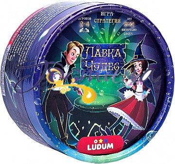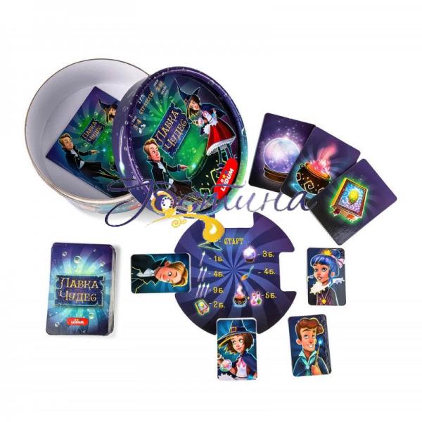 Поле для гри, наділена спеціальними прорізами.Картки із зображенням чарівників - 4 одиниці.Колода карт, де представлені всі чарівні предмети - 44 одиниці.Вкладиш-інструкція з докладними поясненнями.В ігровому процесі можуть бути задіяні два гравця. Середня тривалість близько півгодини. Для зручності в грі задіяні дві мови - українську та російську. Суть забави полягає у відкритті власної лавки чудес, яку необхідно наповнити чарівними предметами.