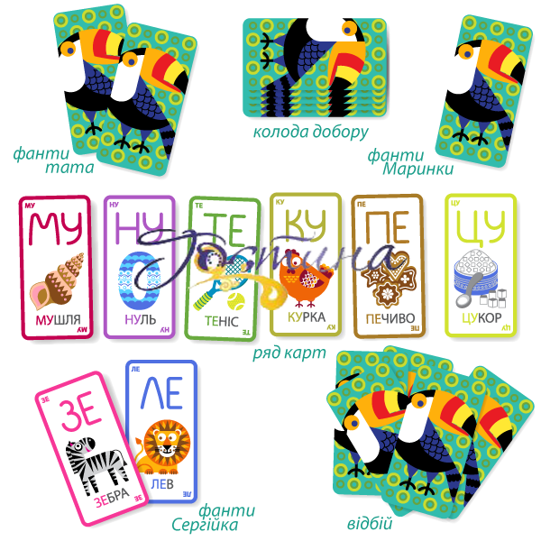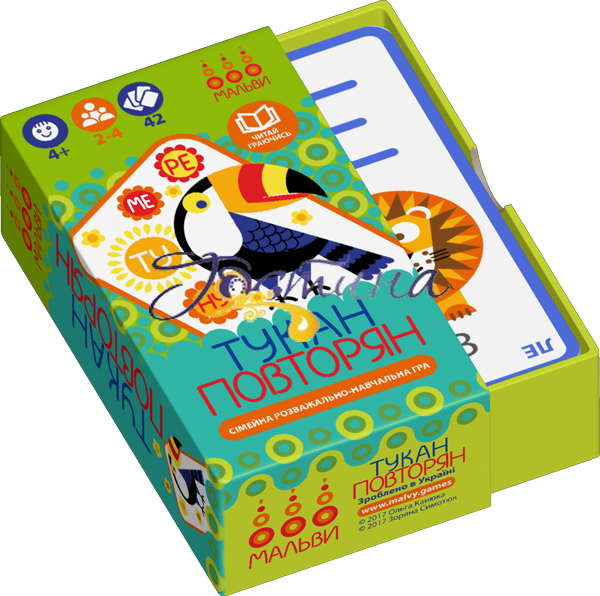 Гра Тукан-повторян складається з 42 карток із буквосполученнями усіх приголосних з голосними У та Е (крім ЙУ та ЙЕ, для них є відповідні букви). Кожне буквосполучення ілюстроване малюнком-підказкою. Проілюстроване слово починається на відповідну букво-пару, тобто МУ — мушля, МЕ  — меч, ТУ — тукан і так далі. Комплектація гри 42 картки з голосними У та Е (буквосполучення МУ, МЕ, ТУ, ТЕ, ШУ, ШЕ та інші).Вік гравців: від 4 років.Кількість гравців: 2-4 гравців, один з яких дорослий.Ціль гри: повеселитись та назбирати найменше фантів. Правила гри Тукан-повторян Коротко: Гравці промовляють ряд буквосполучень, збирають фанти, а потім розігрують їх.