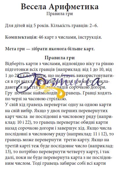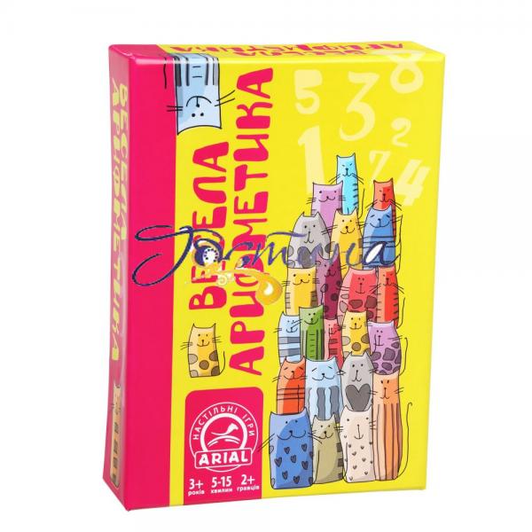 Весела Арифметика' - настільна карткова гра від Arial (Україна).Математична гра, що розвиває пам'ять та вчить дітей послідовності чисел у межах п'яти десятків. Мета гри - якнайшвидше залишитися без карток на руках. відеогляд https://youtu.be/QNy9qkQupuk