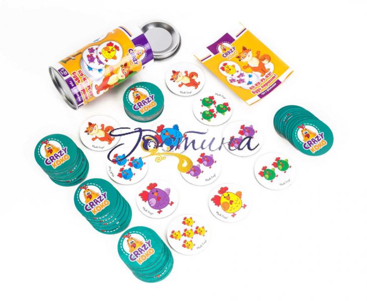 Приготуйся швидко рахувати й кукурікати! Починається змагання за курчат! Знайди п’ятьох пташенят одного кольору, вигукни «ку-ку-рі-ку», схопи фішки швидше за суперників. Але пам’ятай: поблизу блукає лисиця, вона може стягнути твоїх курчат.