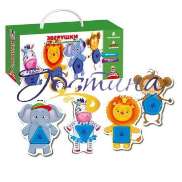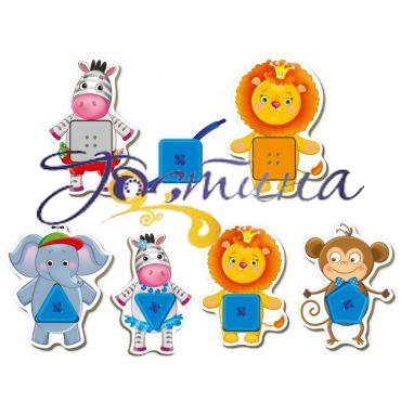 Всі картонні деталі звіряток двосторонні. З одного боку зображено хлопчика, а з іншого – дівчинку. Також на кожній зі сторін є певна геометрична фігура. Малюк повинен вивчити уважно звіряток та намальовані фігури і підібрати ґудзик відповідної форми.
