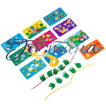 Комплектація: 10 карток із завданнями, 10 долоньок, 2 шнурки, інструкція.
