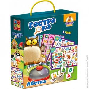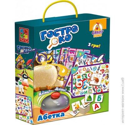 Гра зі дзвоником “Гостре око. Абетка”. Такі різні персонажі розбіглися гральними полями та розкидали навколо себе всілякі предмети та літери! Чи зможеш ти знайти збіги серед малюнків на фішках та на гральному полі? Швидше натискай на дзвоник, поки тебе не випередили друзі! «Дзінь!» – ось і перший збіг! Окрім класичної версії – грай в бінго або у версію без дзвоника!
