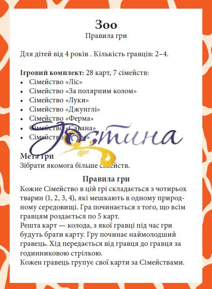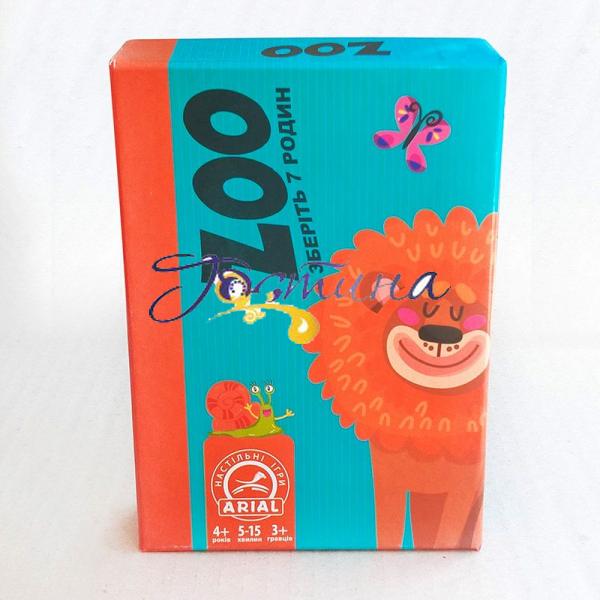 Гра Arial Зоо - це карткова, динамічна і весела гра. Мета гри - зібрати більше повних «сімейств», передаючи картки один одному або виймаючи їх з колоди.У комплекті 28 карт, 7 родин:Сімейство «Ліс»Сімейство «За полярним колом»Сімейство «Луга»Сімейство «Джунглі»Сімейство «Ферма»Сімейство «Саванна»Сімейство «Море»Для дітей від 4 років.