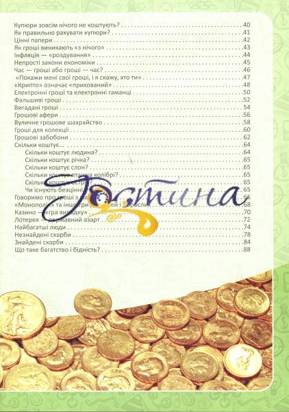 «Життя — гра, у якій рахунок ведеться на гроші», — якось сказав американський бізнесмен Тед Тернер. Гроші супроводжують людину впродовж усього життя і кожен має знати, як вони працюють. Ця книжка — путівник величезним та складним світом грошей, фінансів, економіки. Тут юний читач знайде цікаві відомості про грошові одиниці та грошовий обіг усіх часів та народів, а також практичні поради, що згодом допоможуть йому стати успішною людиною. Адресовано дітям середнього і старшого шкільного віку, а також їхнім дбайливим батькам.