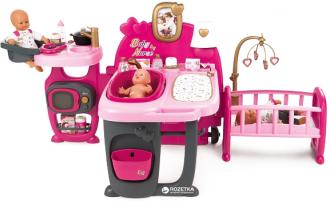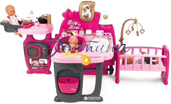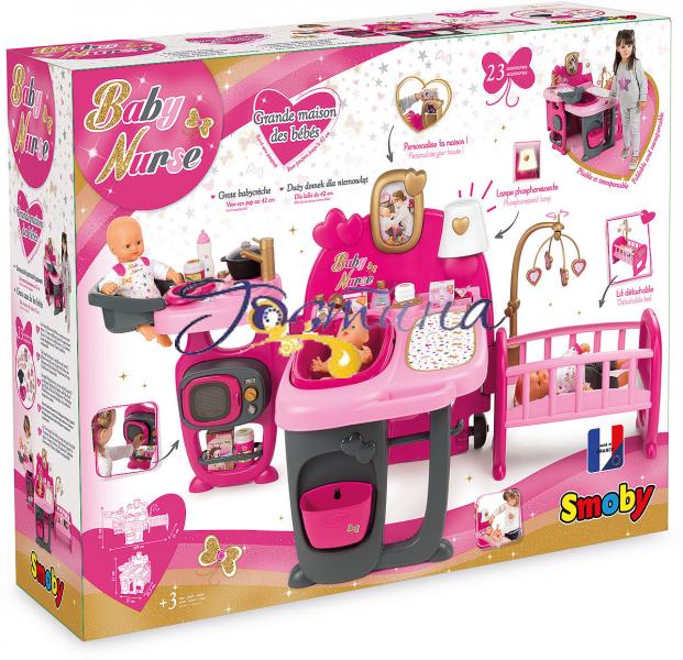 Ігровий центр Smoby Baby Nurse Кімната малюка з кухнею, ванною, спальнею і аксесуарами. Великий ігровий центр для ляльок-немовлят з трьома різними кімнатами: кухня, ванна кімната, спальняУ комплект входять аксесуари для догляду та годуванняЦентр можна прикрасити власним фото, для якого є рамкаЛампа прикрашає центр і дає світлоЛіжечко легко від'єднується від основної частини центруІгровий центр має складну конструкцію і два колеса, для комфортного зберігання і транспортуванняПідходить для ляльок до 42 см компактно складається Розміри: 149.2 x 71 x 71.2 смВага: 6.1 кг