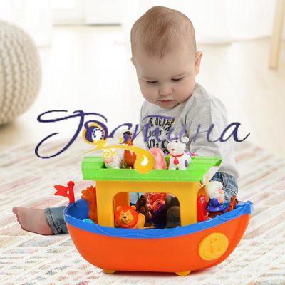 Яскравий ігровий набір Ноїв Ковчег надовго заволодіє увагою Вашого допитливого малюка. Корабель легко возити за собою на мотузочці, адже він на коліщатках. Іграшка чудово озвучена українською мовою. Фігурки 9 тварин потрібно посадити на свої місця за принципом сортера. Якщо дитина все виконав правильно, то зазвучить пісенька. А ще звірята розповідають віршики і видають характерні їм звуки. Вірші та пісні познайомлять дитину з назвами і характеристиками тварин, допоможуть краще пізнати навколишній світ і біблійну історію. При повороті штурвала лунає дзвін, звук корабельного двигуна або плескіт води. При натисканні на барила з рибою і овочами звучать веселі віршики, а Ной співає пісню про Ковчег. На даху кораблика розміщено міні-піаніно з різнокольоровими клавішами. Приємним плюсом стане те, що міні-фігурками можна грати і окремо.