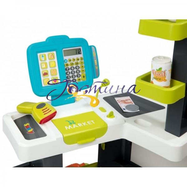 Ігровий набір Інтерактивний супермаркет Smoby Toys City Market зі звуковими ефектами, візком і аксесуарами. Маркет з багатьма аксесуарами (монети, банкноти, імітація овочів і фруктів, упаковка, контейнери) Електронний касовий апарат з функцією калькулятора Електронний сканер зі звуком і підсвічуванням