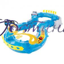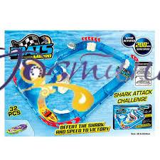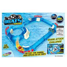 Водний трек зібраний і наповнений водою, глядачі зібралися і жадають видовища! Опустіть за допомогою підйомного крана човен у воду і спробуйте його зловити величезною акулячою пащею! Човен оснащений мікро-робототехнічною сенсорною технологією і готовий до старту відразу після потрапляння в воду.Електричний двигун включається автоматично і човен на великій швидкості почне свій рух по водній доріжці. Човен може рухатися в 4-х напрямках і робити розвороти на 360 градусів. Якщо човен знайде перешкоду, він'відчує' це за допомогою спеціального датчика, встановленого на носі , після чого включить задній хід. Як тільки човен відійде від перешкоди, він поміняє напрямок руху і продовжить свій шлях.На одній з ділянок водного треку човен буде чекати 'неприємний' сюрприз - зубаста паща величезної білої акули ! Акулина паща закривається вручну. Необхідно точно розрахувати, коли човен виявиться поблизу акулячої голови, і закрити пащу.