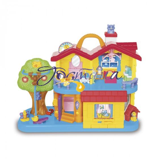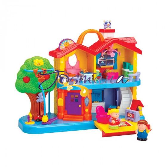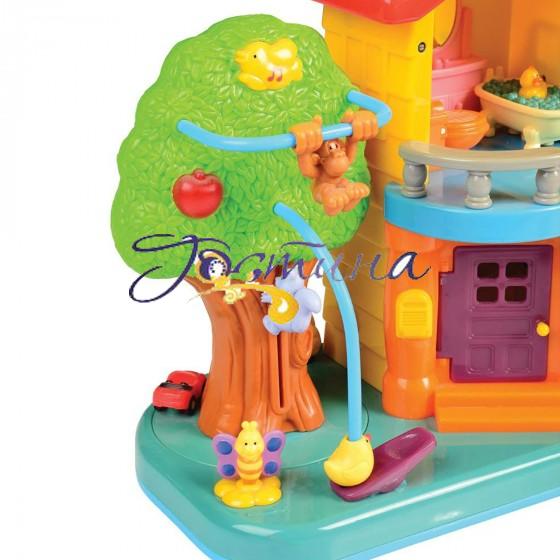 У цьому ігровому наборі ваша дитина зможе знайти двоповерховий будинок з затишним садком, телевізор, фігурки людей, зі смаком обставлену спальню і кухню, ванну і туалет з унітазом, що видає характерні звуки. Таким чином, цей набір дозволить організувати в вашому домі сюжетно-рольові ігри. Двоповерховий будиночок з галявиною наділений світловими і звуковими ефектами, які виникають в момент натискання або повороту фігурок. Тут також запропонована будка з собачкою. Кухонна плита, наявна в наборі, оснащена пальниками. Дах будиночка оснащена рухомий місяцем-сонечком. Таким чином ви зможете змінювати час доби над вашим будинком.Будиночок оснащений зручною ручкою, яка дозволить переносити його в різні місця. Поруч з будиночком варто велике дерево, на якому ростуть світяться яблучка і сидять пташки-кнопки, при натисканні на які чується пташиний спів. Біля дерева знаходиться турнік, на якому крутиться мавпа. Біля дерева, на самій підлозі, знаходиться метелик, який при обертанні запускає машинку.