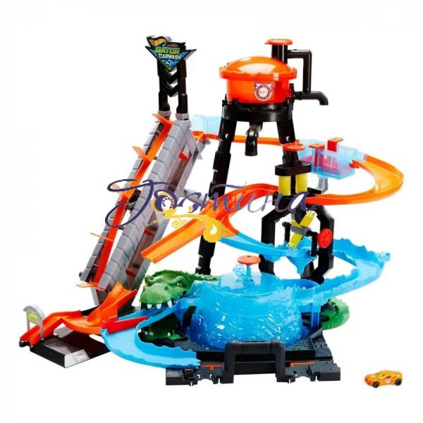 з іншими наборами Hot Wheels Набір містить: ліфт для підйому машинок на верхній рівень башти; 2 контейнери для зміни кольору машинки; величезний алігатор, який чатує на машинки в кінці треку; 1 машинка серії "Зміни колір" для швидкого старту.