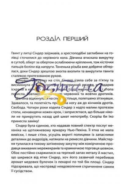 Сіндер, шістнадцятирічна дівчина, чи не найкращий механік Нью-Пекіна. Однак кого цікавить якийсь кіборг — мачуха Сіндер не любить, а інші її зневажають. Таке собі життя, така собі робота в майстерні на міському ринку… Проте все міняється, коли в її крамничці з’являється принц Кай із Нейнсі, поламаним андроїдом. Принц захоплюється Сіндер, не знаючи, що вона кіборг — істота другого сорту. Кай узагалі не уявляє, що дуже скоро і він, і вона опиняться в тугому вузлу інтриг і таємниць. Колонія Місяця, очолювана безжальною та могутньою королевою Леваною, що плекає надію загарбати земні імперії; її армія мутантів і магів-тавматургів; невиліковна хвороба, яка викошує землян; таємничий доктор Ерланд — усе це тісно пов’язано із секретами Сіндер, про які дівчина ще вчора гадки не мала, а сьогодні їй потрібно пірнати в самий центр космічного шторму!