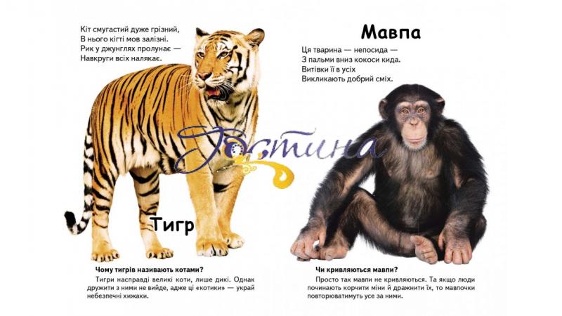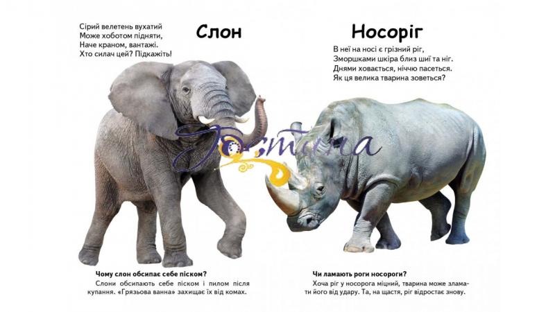 Про звички й особливості кожної тварини у книжці підготовлено цікаве, нестандартне запитання. Запитання з цієї дитячої книжки про екзотичних тварин якнайкраще підійдуть для вікторин, розвитку ерудиції, сценаріїв розвивальних ігор у дитячих садках і центрах, у молодших класах школи Веселі, повчальні віршики розвивають словниковий запас, виробляють почуття вірованого ритму.  Фотографії тварин такі реальні, що створюють відчуття у малюка, що він наразі десь на берегах знаменитої Лімпопо, куди славетний лікар Айболить поспішає на допомогу до своїх екзотичних друзів. Дитяча уява під враженням фотографій лева, жирафи, верблюда, крокодила перелітає то у спекотливу савану, то в жовту пустелю, то на океанське узбережжя.  Тому працювати з цією книжкою дітям вельми цікаво.  Оптимальних розмірів формат, міцний, високоякісний, приємний на дотик картон роблять її практичною і зручною для читання скрізь, де лише закортить дитині.